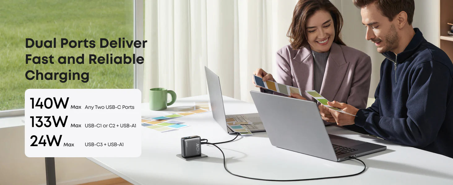 Experience unparalleled speed with this 140W charger, featuring GaN technology. It also includes comprehensive safety features like short-circuit and over-temperature protection. (Note: Maximum output reduces to 134W when charging four devices.)